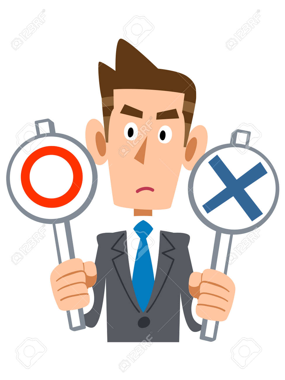 マルとバツの札を両手に持ち考える若いビジネスマンの全身 イラスト素材 フォトライブラリー Photolibrary